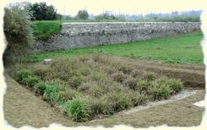 | Für die Pflanzenkläranlage wird ein Becken, dessen Größe von der Abwasser Art und Menge abhängt, ausgehoben. Das Becken wird mit einer PVC Plane ausgelegt. Diese enthält bereits für die Rohranschlüsse vorgesehene abgedichtete Öffnungen (patentiert). Das abgedichtete Becken wird dann mit Kies und Wasserpflanzen gefüllt. Der Wasserstand im Becken liegt ständig 10-15 cm unter der Oberfläche der Kiesschicht. Er wird anhand unserer patentierten Wasserstandsregulierung kontrolliert. Die Entstehung von schlechten Gerüchen und lästige Insekten wird dadurch vermieden. |